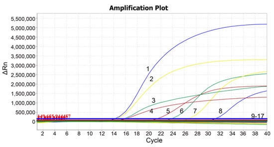 Specificity analysis. 1: p-TGEV; 2: p-PDCoV; 3: p-SADS-CoV; 4: p-PEDV; 5: PEDV; 6: SADS-CoV; 7: PDCoV; 8: TGEV; 9–16: ASFV, FMDV, CSFV, PRRSV, PRV, PoRV, PCV1, and PCV2; 17: negative control. There were specific amplification curves only for PEDV, TGEV, PDCoV, and SADS-CoV.