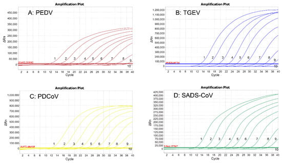 Different porcine viruses were tested to evaluate the specificity of the quadruplex qRT-PCR. The results illustrated that only PEDV, TGEV, PDCoV, and SADS-CoV recorded corresponding signals and generated specific amplification curves, while ASFV, FMDV, CSFV, PRRSV, PRV, PoRV, PCV1, and PCV2, could not detect any positive signals and did not demonstrate any amplification curves (Figure 2), indicating the extreme specificity of the quadruplex qRT-PCR.