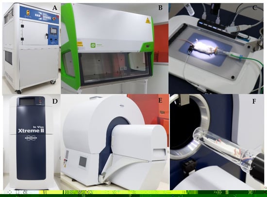 Technological equipment park. The experimental area includes modern park technology with equipment for radiotherapy [Rad-Source-2000 X-ray Irradiator] (A), laminar flow (B), a platform to perform surgical procedures with controlled temperature and accoplated anesthesia inhalator (C), Xtreme II (D) device (to analyze fluorescence, luminescence, and radioisotope), and a microtomography scanner (E) for small animals (F).