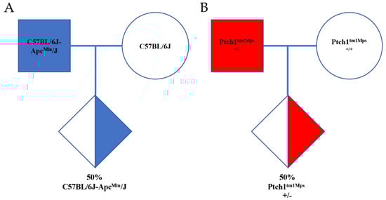 The mice born from C57BL/6J-ApcMin/J and STOCK Ptch1tm1Mps/J colonies were genotyped to detect whether they were heterozygotic or homozygotic for the APC or PTCH1 mutation. For this, ear fragments were collected from mice aged 1 to 3 weeks and submitted to DNA extraction using Biopur Mini Spin Plus Kit (BIOPUR, Biometrix Diagnostic Ltd.a), following the manufacture’s recommendations. DNA samples were quantified by Nanodrop (ThermoFischer, Waltham, MA, USA). APC model was submitted to real-time PCR assay, according to Jackson Laboratory’s protocol (https://www.jax.org/strain/002020, accessed on 10 May 2022) (Bar Harbor, MA, USA) [,]. The mutant animals present a single nucleotide variant (T > A in nucleotide 2549) in APC gene. This strain was maintained by breeding between heterozygote males C57BL/6J-ApcMin/J and wild-type C57BL/6J females in our animal facility (Figure 3). APC mice were observed for the following signs of distress: abdominal edema, low-conditioned score, weakness, dehydration, hunched posture, abnormal breathing, anemia, ungrooming or piloerection, abdominal distention, decreased activity and diarrhea. When mice exhibited any of these signs of distress they were euthanized.