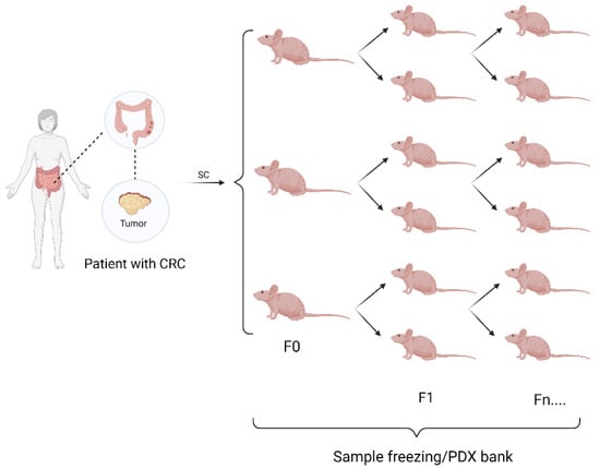 Generation of solid-tumor PDX models. Establishment of the animal model derived from a human colon tumor fragment. Small fragments are implanted in the subcutaneous tissue of three animals (F0). Next, the tumors that develop are reimplanted in another two animals (F1), successively (Fn…) All fragment samples are freezing in PDX banks.