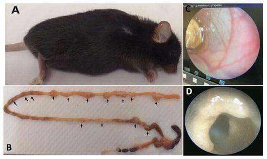 Figure representing heterozygous mouse of the C57BL/6J-ApcMin/J. (A) C57BL/6J-ApcMin/J mouse heterozygote with intestinal lesions; (B) Polypoid lesions along of the intestine (arrows); (C,D) Illustrative figure obtained using Coloview Mainz-Storz equipment to identify intestinal lesions in C57BL/6J-ApcMin/J mice.