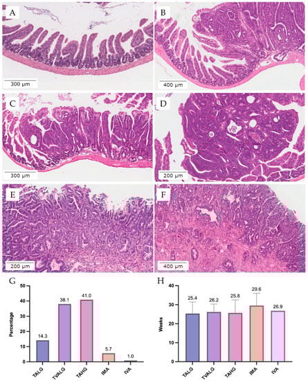 The histopathology of small intestinal and colonic lesions were ranked following the World Health Organization’s (WHO) Classification of Tumors of the Digestive System (5th edition) for benign and malignant epithelial tumors and precursors of the colon and rectum. The animal lesions observed were divided into tubular adenoma, tubulovillous adenoma, intramucosal adenocarcinoma, and invasive adenocarcinoma. Moreover, adenomas were subdivided into low and high grades [].