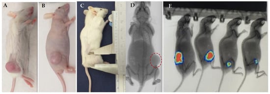 Representative xenograft models generated at BCHAF using different tumor type and cells (primary cell culture or commercial tumor cells). All tumor cells were inoculated subcutaneously, in the right flank, of NUDE (B,D) or NSG mice (A,C,E). (A–E) Illustrative image representative of tumor type of animal in different phases of tumor development. Images representative of (A,E) brain tumor (glioblastoma); (B,D) lung cancer; (C) Tumor measure with a caliper (brain tumor); the presence of tumor mass was documented using a microtomography (Micro-CT, Bruker) (D) or Xtreme II (Bruker) (E).