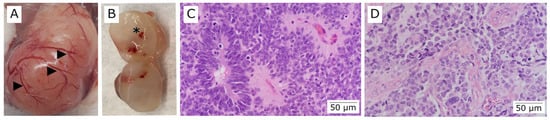 Of fifty-two PTCH1 heterozygous mice evaluated, twelve (12/52, 23,07%) showed enlargement of the cerebellum (Figure 8). These animals displayed apparent symptoms of ataxia and diminished activity. The presented symptoms at a median age of 30.3 (± 8.4) weeks, and hydrocephalus was detected in six (6/12, 50,0%) (Figure 8C). Tumors were more frequent in male (n = 8) than female (n = 4). The brains affected by medulloblastomas were easily recognized by their abnormal cerebellar growth, and the tumors appeared as mass lesions compressing neighboring normal-appearing cerebellar tissue (Figure 8B,C).