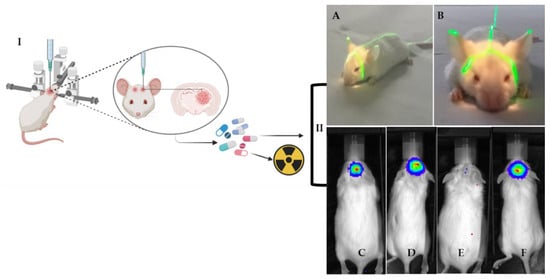 I. Drawing of orthotopic implantation of brain tumor cells in immunocompromised mice to therapeutic treatment (drug and radiotherapy). II. Illustrative images of orthotopic mouse models to assess treatment response. (A,B) Positioning the animal on the linear accelerator to radiotherapy treatment. The field light shows a defined area of 2 × 2 cm in which the radiation was directed to the tumor area (craniocaudal view). (C–F): Luciferase bioluminescence for: (C) Control (mouse treated with the vehicle); (D) Drug (mouse treated only with drug); (E) Radiotherapy + Drug (combination of treatments) and (F) Radiotherapy (mouse treated only with radiotherapy).