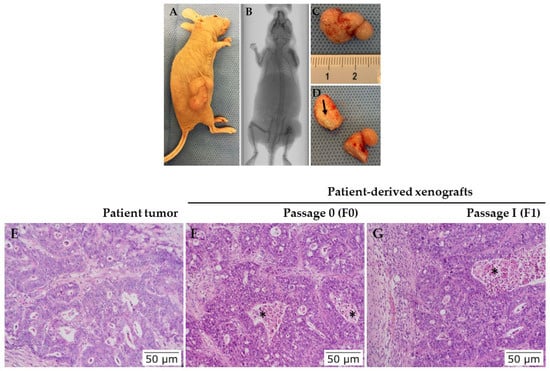 Establishment of patient-derived xenograft (PDX) models. (A) Representative image of colorectal tumor generated in the subcutaneous of NUDE mice. The tumor exhibited intense neovascularization and vases ramification (arrows). (B) The presence of tumor mass was documented using microtomography (Micro-CT, Bruker). (C) The tumor was analyzed macroscopically and processed for histological analysis. (D) Longitudinally sectioned tumor illustrating presence of necrosis area (arrow). (E) H&E staining of the patient’s tumor after surgical resection (200X magnification). (F,G) H&E staining of tumors F0 and F1, generated from subcutaneous implantation of tumor fragments in NUDE mice (200X magnification). Dirty necrosis areas (stars).