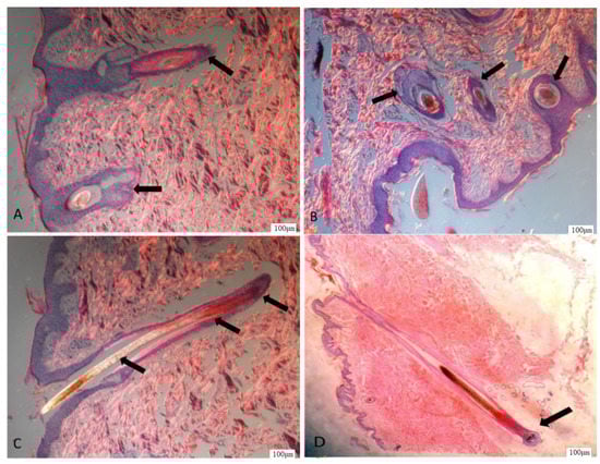 - Sharov, A.A.; Sharova, T.Y.; Mardaryev, A.N.; Tommasi di Vignano, A.; Atoyan, R.; Weiner, L.; Yang, S.; Brissette, J.L.; Dotto, G.P.; Botchkarev, V.A. Bone morphogenetic protein signaling regulates the size of hair follicles and modulates the expression of cell cycle-associated genes. Proc. Natl. Acad. Sci. USA 2006, 103, 18166–18171. [Google Scholar] [CrossRef]