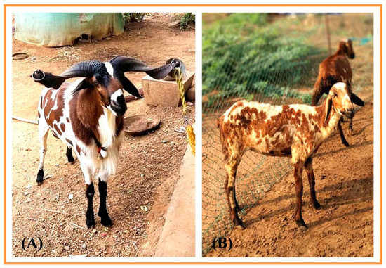 The Vembur sheep (Figure 1) are native to the Vembur village of the Pudur Taluk, in the Thoothukudi district of Tamil Nadu (8.62° N and 77.97° E). They are tall animals with irregular black and fawn patches all over their white bodies. The tail is thin and short, and the ears are medium in size and drooping. The ewes have polls, whereas the males have horns. The body is covered with short hair, which is not shorn. The lambing percentage of farmers’ flocks is 80 and the litter size is single. Breeding is generally performed on the basis of selection from within the flock. There are two breeding seasons in the Vembur breeding tract: most of the animals are in heat from March to May, and a few are so from July to September.