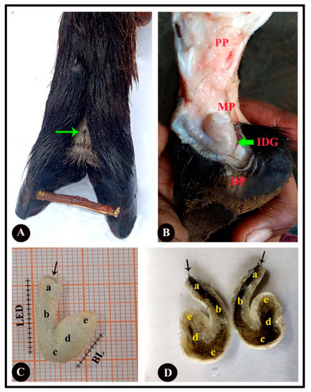 Figure 2. (A) Dorsal view of the interdigital region; the thin green arrow points to opening of the interdigital skin fold. (B) Medial view of the interdigital region; the thick green arrow points to the position of the sinus interdigitalis. IDG, interdigital gland. (C) The gland resembles a tobacco pipe in shape, with a wide body and long narrow neck. (D) Sagittal sectional view of the interdigital gland to show excretory duct filled with wooly fibers and its luminal content. a—orifice; b—excretory duct; c—flexure (distal part of the body); d—body of the sinus; e—fibrous attachment to the proximal part of the gland; BL—body length; LED—length of excretory duct; thin black arrow—external orifice; PP—proximal phalanx; MP—medial phalanx; DP—distal phalanx.