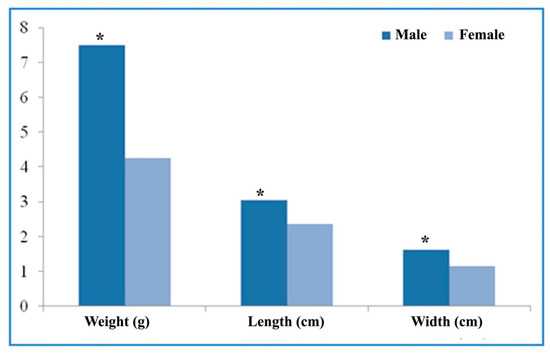Figure 3. Mean values of the morphometric parameters (length, width, and weight) of male and female interdigital glands (CG). * p < 0.05, male gland compared to female gland.