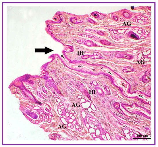 Both the pouch (wide body) and the neck (narrow duct) of the interdigital gland are covered by three distinct layers: fibrous capsule, epidermis, and dermis (Figure 4). The fibrous capsule is the outermost part of the interdigital sinus. It is composed of dense connective tissue, containing several parallel bundles of collagen fibers, adipose tissue, nerve fibers, blood vessels, etc. The epidermis consists of a stratified squamous epithelium and the mucosal folds that project into the lumen. In addition, the stratum granulosum is well-developed, whereas the stratum papillare is prominent and contains loose connective tissue and elastic fibers. Melanin granules are observed in the stratum basale (Figure 5). The dermis layer is composed of hair follicles, arrector pili muscles and apocrine and sebaceous secretory lobules of different sizes. The upper portion of the dermis is occupied by sebaceous secretory lobules, hair follicles, and arrector pili muscles, whereas the lower portion is occupied by clusters of apocrine secretory glands (Figure 6). The sebaceous secretory glands are always associated with hair follicles (Figure 7). The glandular secretions (both apocrine and sebaceous) empty directly onto the narrow excretory duct that opens into the external orifice (Figure 8).