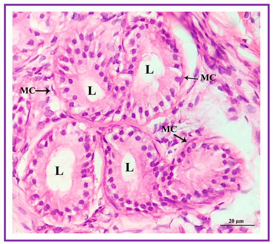 Figure 9. The apocrine gland is surrounded by collagenous or interlobular connective tissue of the hypodermis. The myoepithelial cells (MC) surround the apocrine tubules. L: lumen.