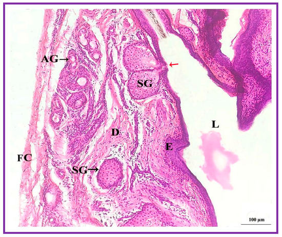 Figure 10. Photomicrograph of the interdigital sinus of male Vembur sheep showing the quite large holocrine sebaceous secretory lobules (SG) compared to apocrine gland (AG). Red arrow: secretion directly discharged into the lumen (L); FC: fibrous capsule; E: epidermis; D: Dermis.