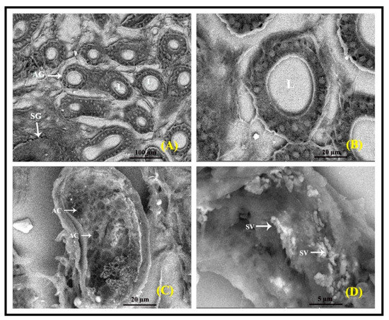 Scanning electron microscopy (SEM) was adopted to evaluate the interdigital glands (Figure 12). The gland shows two glandular components: one displaying apocrine secretory lobules and the other with sebaceous secretory units (Figure 12A). The apocrine secretory lobules are quite tall and often exhibit apocrine blebs, designating the pinching off of secretion to the lumen (Figure 12B). The sebaceous secretory lobules are positioned clustering the inner surface and appear like a group of bubbles (honeycomb) and clusters of secretory acinar cells (Figure 12C). The apocrine lobules usually appear as a group of tortuous tubules, and their lumen is often occupied by secreted content and the secretory vesicles (Figure 12D).