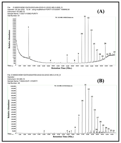 Figure 13. The gas chromatographic profiles of the volatile compounds of male (A) and female (B) interdigital gland secretion. For details, please refer Table 1.