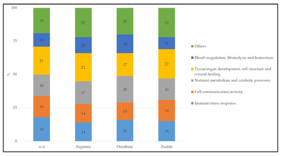 When the identified proteins were submitted to the STRING database, 365 proteins of the w/o group could be found for Felis catus, which are associated with 115 biological processes. For the arginine group, 286 proteins were found and are involved in 88 biological processes. Comparable values were observed for the ornithine group, with 260 identified proteins in 84 biological processes. In the zeolite group, 342 proteins were found in the STRING database, which are associated with 115 biological processes.