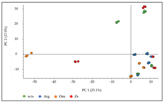 Principal component analysis plot of the urine proteome of cats (n = 4) fed a high-protein diet without (w/o) or with the supplementation of arginine (Arg), ornithine (Orn) or zeolite (Ze). The plot depicts the triplicate determination for each cat and feeding group.