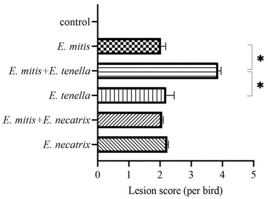 The lesion score of chicken intestines with single and mixed infections of Eimeria species. The asterisk denotes that two groups significantly differed (p < 0.05).