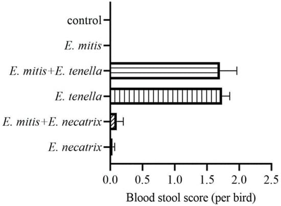 Bloody stools were observed in the single E. tenella or E. necatrix infection, E. mitis/E. necatrix co-infection, and E. mitis/E. tenella co-infection groups, respectively (Figure 2). The mean blood stool scores in these groups were 1.7, 0.033, 1.733, and 0.1, respectively. In contrast, no bloody stools were noted with pure E. mitis infection (Figure 2), which is consistent with the low virulence of E. mitis.