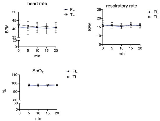 We also found no significant difference in HR, RR, and SpO2 between the experimental groups as shown in Figure 2. In one animal, HR and RR were not recorded before sedation due to the nervous temperament of the pony. Three ponies, two in the FL group and one in the TL group, received additional sedation (0.3 mg/kg of IV xylazine) because sedation score was 1. No ponies showed an induction score of 0 or 1. Time from sedation to induction and quality of induction were similar in both groups. The anaesthesia time (time from induction to the end of the infusion), the time to perform the surgery (aseptic preparation, spermatic cord infiltration, and surgery), and the time from the end of the infusion to standing (recovery time) were similar in both groups (Table 1). The numbers of attempts to achieve standing position was two in one animal. The surgery was completed in all the animals, without anaesthetic or surgical complications. No animals required rescue analgesia postsurgery.