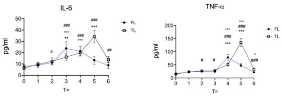 Timeline of IL-6 and TNF-α plasmatic levels measured by ELISA assay. FL, funicular group; TL, testicular group. All values are shown as the mean ± standard deviation (SD) of N observations (N = 8) for each group. # p < 0.05 versus T = 0 of TL group; ## p < 0.01 versus T = 0 of TL group; ### p < 0.001 versus T = 0 of TL group; °°° p < 0.001 versus T= 0 of TL group; * p < 0.05 FL versus TL; ** p < 0.01 FL versus TL; *** p < 0.001 FL versus TL.