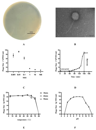 Recently, the phage has been considered to be one of the effective methods against the multiple drug resistance of bacteria []. Phage has the characteristics of wide distribution, variety, and strong host specificity, so it can be used as a new biological agent for the treatment of bacterial infection []. Unlike antibiotics, phages can proliferate rapidly and eliminate host bacteria. And they will not cause substantial damage to the normal flora of animals or humans []. Many studies have shown that phages can effectively treat experimentally infected animals, and phages have become one of the most promising measures against drug-resistant bacteria [,,]. Moreover, phages have been commercialized to deal with the current problems of food safety, environmental disinfection, and the treatment of bacterial diseases [,]. Many phages of E. coli have been isolated and sequenced, but few phages are suitable for clinical application, including the development of phage resistance, regulation of phage-based products, and unknown environmental consequences of phage treatment []. Therefore, it is necessary to continue to search for natural E. coli phages.