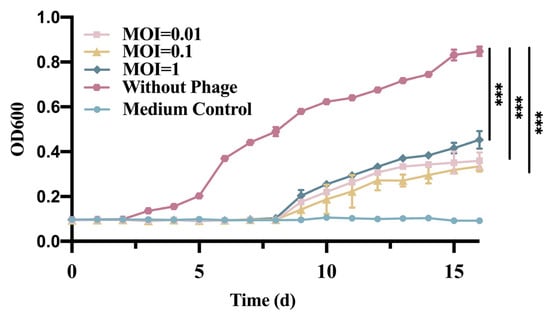 Effect of phage vB_EcoS_GN06 treatments on the growth of E. coli GXEC-N22 at different MOI in MH broth (***: p < 0.001).