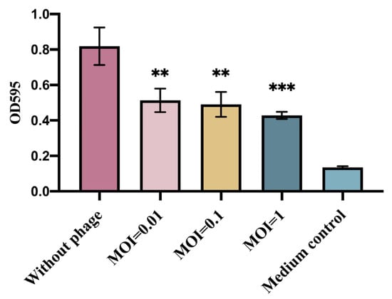 The inhibition of E. coli biofilm formation by phage GN06 was examined by 96-well plate crystalline violet staining. The phage significantly inhibited the biofilm formation of GXEC-N22 at MOI = 0.01, 0.1 and 1 compared to the negative control (Figure 3) (p < 0.01, p < 0.001).