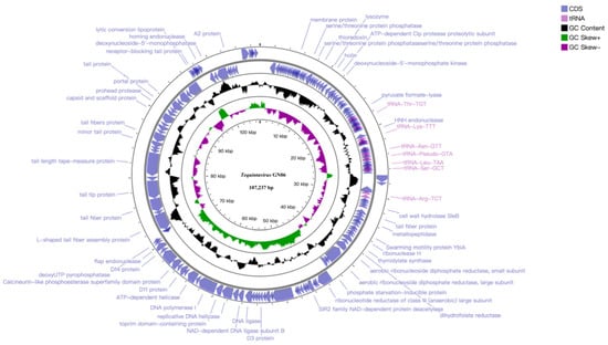 The whole genomic analysis indicated that phage GN06 has double-stranded DNA of length 107, 237 bp, with a G+C% content of 39.20% (Figure 4). BLASTn analysis showed that phage GN06 shares 94.07% identity (88% genome coverage) with Escherichia phage vB_EcoS_HASG4 (GenBank accession MK373797.1). The genome contained 155 predicted open reading frames (CDSs), and the inverted CDSs accounted for 69.03% (107 CDSs) of the total genome. No virulence genes, drug-resistance genes or lysogeny genes (e.g., integrase) were detected. Among the one hundred and fifty-five CDSs, of which fifty had been assigned to functional genes; four CDSs encode proteins related to DNA replication and repair; ten CDSs are involved in encoding phage structure proteins; four CDSs are associated with phage cleavage and thirty-two CDSs are responsible for encoding proteins related to transcriptional regulation. The remaining 104 were annotated as hypothetical proteins and 1 no-hits protein (Supplementary Material). In addition, nineteen tRNA genes were found in the genome of phage GN06 and two of them were predicted to be pseudogenes. The annotated complete genome sequence of the GN06 phage was deposited in GenBank under accession number OM867526.
