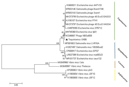 To investigate the evolutionary relationship that phage GN06 from the “Tequintavirus” displays within the Markadamsvirinae subfamily, phylogenetic analyses were performed on the whole genome of 20 published phage genomes and GN06 (Figure 5). In the phylogram tree the phage GN06 was more closely related to “Tequintavirus” (phage NBSal005 and fp01). In addition, the “Tequintavirus” cluster into a single monophyletic clade.