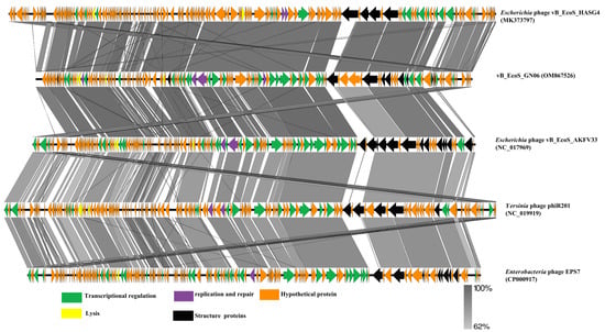 For further similarity analysis, the phage GN06 was subjected to genomic multiple comparisons with the phage of the genus “Tequintavirus”. The results showed that phage GN06 had a high protein homology with them (>62%). The homologous proteins modules mainly include DNA transcriptional regulation, DNA replication and repair, lysis, and structural protein, among others (Figure 6).