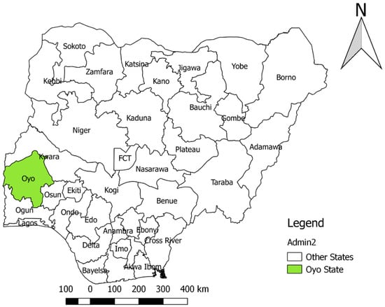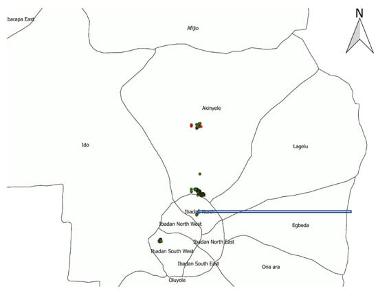 There are eleven Local Governments Areas in the Ibadan Metropolitan area, consisting of five urban local governments (Ibadan North, Ibadan North-East, Ibadan North-West, Ibadan South-East, and Ibadan South-West) and six semi-urban local governments (Akinyele, Egbeda, Ido, Lagelu, OnaAra, Oluyole) []. The human population of Ibadan is estimated to be 3,649,000 []. The study locations covered three of the 11 Local Government Areas in the Ibadan metropolitan areas: Ibadan North, Ibadan South-West and Akinyele Local Government Areas.