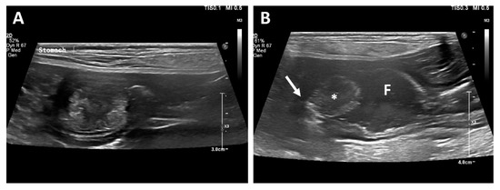 Longitudinal ultrasonographic examination. A mass arising from the mucosal layer was identified (A). A sessile echogenic lesion (asterisk) with a broad base (arrow) arising from the mucosa was identified after feeding water (B). Fluid (F) is present in the stomach.