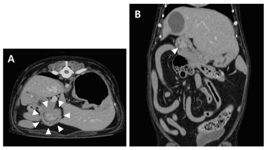 Computed tomography (CT; LightSpeed, GE Medical Systems, Milwaukee, WI, USA) was performed to evaluate the gastric lesion. With the patient positioned in ventral recumbency, a contrast study was performed after administration of the contrast medium (Omnipaque 300, GE Healthcare, Milwaukee, WI, USA). Contrast uptake was assessed in the late venous phase. Post-contrast CT images revealed a mass (17 × 12 × 15 mm) cranial to the pyloric antrum, and the contrast enhancement of the mass was similar to that of the surrounding gastric wall (Figure 2). No contrast leakage was identified.
