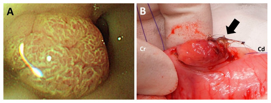 Gross appearance of the cranial surface of the mass during endoscopy (A). A lump of hair firmly attached to the ulcerated surface was identified at the caudal side of the mass (B).