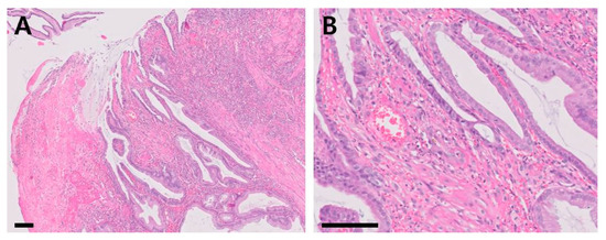 Histopathological sections of the mass (hematoxylin and eosin stain; (A): ×100, scale bar = 100 µm, (B): ×400, scale bar = 50 µm).