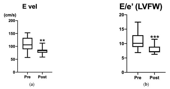 | E/e’ LVFW | 10.9 ± 2.9 | 8.0 ± 1.6 | 0.0008 * | −4.140 to −1.470 |