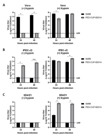 Infectivity of PEDV strains SM98 and PED-CUP-B2014 in various cells. Vero (A), IPEC-J2 (B), and 3D4/21 (C) cells were infected with SM98 or PED-CUP-B2014, with or without 10 µg/mL trypsin. At 24 or 48 h post-infection, virus titers were determined using TCID50 assay. Results are expressed as the mean (n = 3) ± SD. *, p < 0.05; ***, p < 0.0001. LOD, limit of detection.