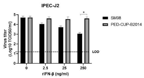 IFN susceptibility of PEDV strains SM98 and PED-CUP-B2014. IPEC-J2 cells were treated with the indicated concentrations of porcine recombinant IFN-β for 1 h, and then infected with SM98 or PED-CUP-B2014 for 1 h in the presence of 10 µg/mL trypsin and IFN- β. At 12 h post-infection, virus titers were determined using TCID50 assay. Results are expressed as the mean (n = 3) ± SD. *, p < 0.05. LOD, limit of detection.