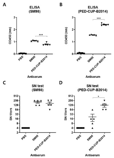 PED vaccination in sows has shown that neutralizing antibodies provided through colostrum play an important role in the prevention of PEDV in piglets []. The neutralizing activity of the antibodies induced by SM98 or PED-CUP-B2014 against each virus was evaluated. BALB/C mice were immunized with SM98 or PED-CUP-B2014, and serum samples were collected at 28 days post-immunization. The IgG levels against SM98 as the coating antigen were 1.093 ± 0.047 in SM98 antisera and 0.795 ± 0.103 in PED-CUP-B2014 antisera, respectively (Figure 3A). The IgG levels against PED-CUP-B2014 as the coating antigen were 1.570 ± 0.031 in SM98 antisera and 2.406 ± 0.077 in PED-CUP-B2014 antisera, respectively (Figure 3B). The SN titers against SM98 of both antisera were similar, with 204.8 ± 70.1 in SM98 antisera and 166.4 ± 85.9 in PED-CUP-B2014 (Figure 3C). The SN titers against PED-CUP-B2014 were six-fold higher in PED-CUP-B2014 (128.0 ± 78.4) than in SM98 antisera (21.6 ± 24.3) (Figure 3D). These results indicate that the PED-CUP-B2014 strain is resistant to antibodies against SM98 strains.