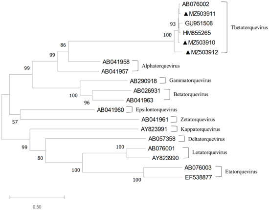 Phylogenetic tree constructed using the full-length TTCaV genomes and the reference TTV strain genomes. The maximum likelihood method and 1000 bootstraps were used. The branches with a bootstrap value greater than 70 were considered strong bootstrap support (p < 0.05) [23]. The three TTCaV isolates identified in this study are marked with closed triangles and were grouped into Thetatorquevirus.