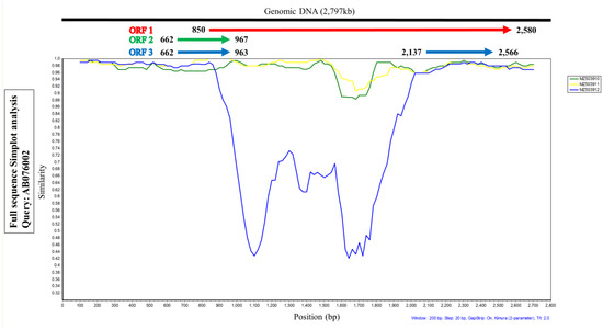 Similarity plot analysis using the three full-length genomes of TTCaV isolated in this study and the Japanese prototype Cf-TTV10 (query). ORF1 region of the MZ503912 strain showed lower similarities than the other two TTCaV strains.