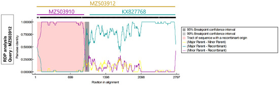 Recombination analysis using full-length TTCaV genome. MZ503912 was considered a recombinant of MZ503910 strain (minor parent) isolated from Republic of Korea and KX827768 strain (major parent) isolated from China.
