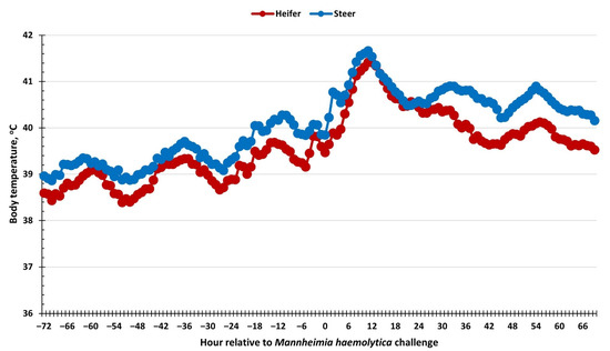 Influence of calf sex on the body temperature response to a dual viral–(bovine herpesvirus-1; 1 × 108 pfu/nostril) bacterial (Mannheimia haemolytica; 1.3 × 107 cfu) respiratory disease challenge. Rectal temperature was measured every 5 min and averaged across hours from −72 to 69 h relative to the challenge with Mannheimia haemolytica. Body temperature increased (p < 0.01) following Mannheimia haemolytica challenge and was reduced in heifers compared to steers (sex: p < 0.01). SEM ± 0.22 °C.