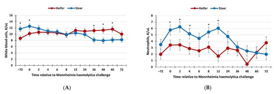 The potential for sexually dimorphic innate immune responses to respiratory disease was evaluated, where eight steers and seven heifers (280 ± 4 kg) were subjected to a viral–bacterial respiratory disease challenge utilizing bovine herpesvirus-1 (BoHV-1; intranasal; 1 × 108 PFU/nostril) and Mannheimia haemolytica (MH; intratracheal; 1.3 × 107 CFU/head) administered 72 h later. Body temperature was lesser in heifers than steers (p < 0.01). There was a sex × time interaction (p = 0.05) for white blood cells where heifers had reduced concentrations compared with steers at −72 and 0 h but greater concentrations from 36 to 60 h post-MH. Concentrations of neutrophils were lesser in heifers compared to steers from 0 to 4 h, and from 8 to 12 h (p = 0.03). Lymphocytes were greater in heifers compared to steers at 12 h and from 36 to 60 h post-MH (p < 0.01). The neutrophil–lymphocyte ratio was lesser in heifers compared to steers from 2 to 24 h and at 48 h post-MH (p < 0.01). Monocytes were greater in heifers compared to steers from 24 to 60 h post-MH (p < 0.01), while eosinophils were greater in heifers compared to steers at 48 and 60 h (p < 0.01). Serum IL-4 was lesser in heifers compared to steers at 0 h and from 2 to 72 h post-MH challenge (p = 0.02). Non-esterified fatty acid concentrations were lesser (p < 0.01) in heifers compared to steers from 2 to 4 h post-MH challenge. Urea nitrogen concentrations were greater (p < 0.01) in heifers than steers at 36 h post-MH challenge. Data from this study reveal distinct differences in the acute phase response following a respiratory disease challenge where steers produced an early response, while the response in heifers appeared to be delayed.