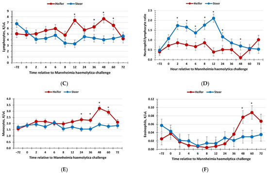 Influence of calf sex on the hematology response to a dual viral–(bovine herpesvirus-1; 1 × 108 pfu/nostril) bacterial (Mannheimia haemolytica; 1.3 × 107 cfu) respiratory disease challenge. (A) White blood cells: there was a sex × time interaction (p = 0.05) where heifers had less white blood cells at −72 and 0 h but had greater concentrations at 36, 48, and 60 h compared to steers. (B) Neutrophils were reduced in heifers at 0, 2, 4, 8, and 12 h compared to steers (sex × time: p = 0.03). (C) Lymphocytes were greater in heifers compared to steers at 12, 36, 48, and 60 h post-challenge (sex × time: p < 0.01). (D) The neutrophil:lymphocyte ratio was reduced in heifers from 2 to 24 h and at 48 h post-challenge (sex × time: p < 0.01). (E) Monocytes were greater in heifers from 24 to 60 h post-MH challenge (sex × time: p < 0.01) and (F) eosinophils were greater in heifers than steers at 48 and 60 h post-challenge (sex × time: p < 0.01). * Sexes differ p ≤ 0.05.