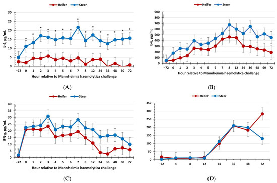 Influence of calf sex on the (A) interleukin-4 (IL-4); (B) interleukin-6 (IL-6); (C) interferon-γ; and (D) haptoglobin response to a dual viral–(bovine herpesvirus-1; 1 × 108 pfu/nostril) bacterial (Mannheimia haemolytica; 1.3 × 107 cfu) respiratory disease challenge. (A) There was a sex × time interaction (p = 0.02) for concentrations of IL-4 where they were lower in heifers than steers at 0 h and from 2 to 72 h post-MH challenge. (B) There was a tendency (p = 0.10) for IL-6 concentrations to be reduced in heifers compared to steers. * Sexes differ p ≤ 0.05.