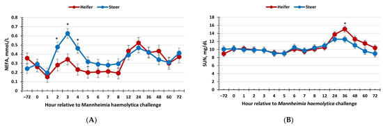 Influence of calf sex on the (A) non-esterified fatty acid (NEFA) and (B) serum urea nitrogen response to a dual viral–(bovine herpesvirus-1; 1 × 108 pfu/nostril) bacterial (Mannheimia haemolytica; 1.3 × 107 cfu) respiratory disease challenge. (A) There was a sex × time interaction (p < 0.01) for NEFA concentrations where heifers had reduced concentrations from 2 to 4 h post-challenge relative to steers. (B) A sex × time interaction (p < 0.01) was observed for serum urea nitrogen concentrations such that heifers had greater concentrations at 36 h and tended to have greater concentrations at 60 h compared to steers. * Sexes differ p ≤ 0.02.
