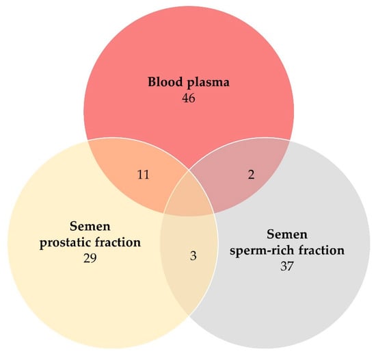 - Batruch, I.; Lecker, I.; Kagedan, D.; Smith, R.C.; Mullen, B.J.; Grober, E.; Lo, K.C.; Diamandis, E.P.; Jarvi, K.A. Proteomic Analysis of Seminal Plasma from Normal Volunteers and Post-Vasectomy Patients Identifies over 2000 Proteins and Candidate Biomarkers of the Urogenital System. J. Proteome Res. 2011, 10, 941–953. [Google Scholar] [CrossRef]